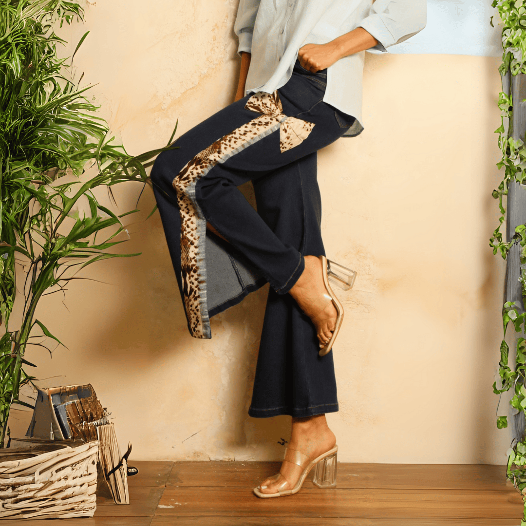 Diseñado para destacar, el pantalón Refugio fusiona fuerza y movimiento con un diseño en denim oscuro decorado con franjas laterales en animal print. El contraste visual estiliza la silueta, mientras que la estructura de bota recta mantiene el balance entre audacia y elegancia.