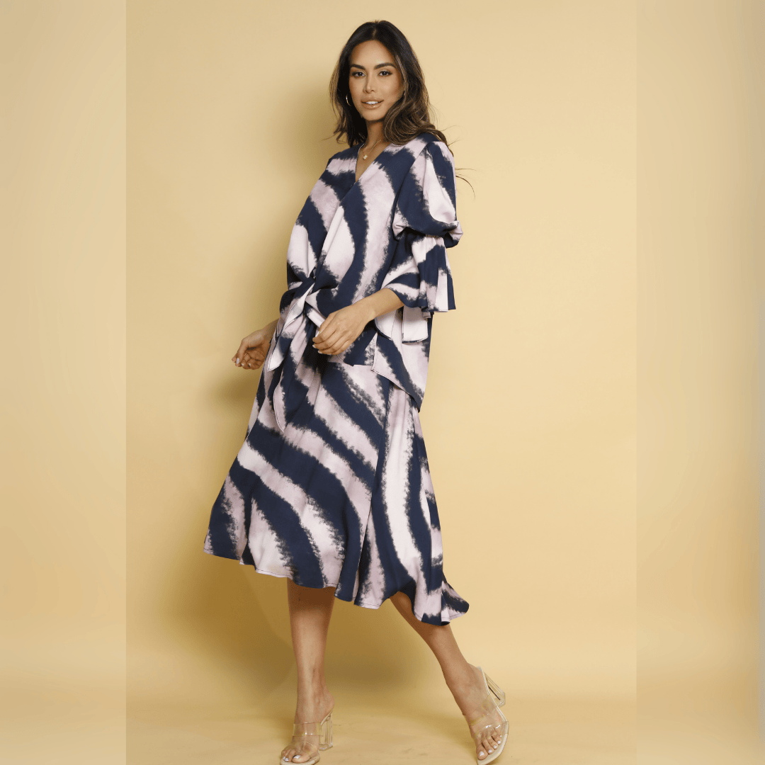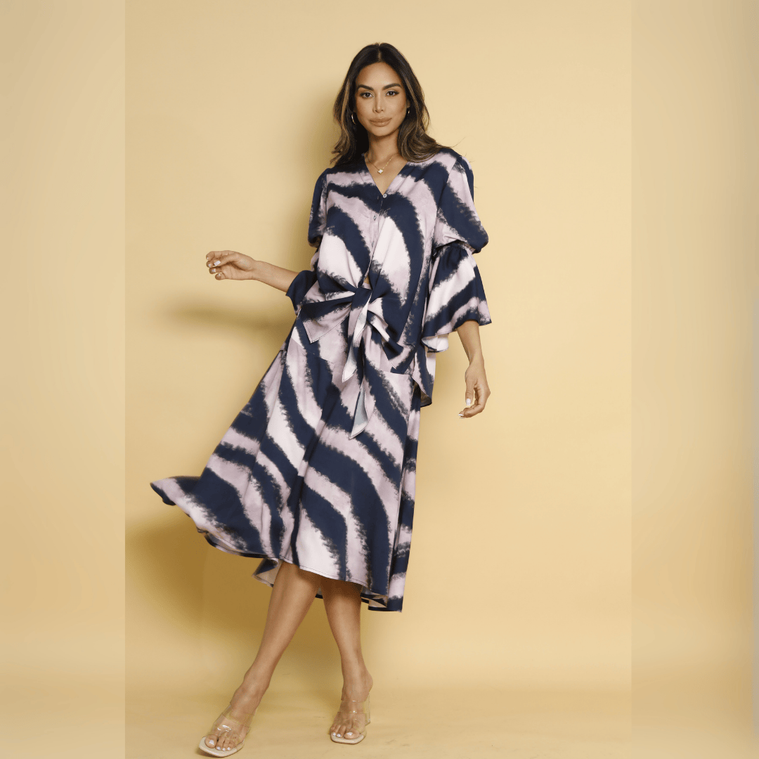 Con un estampado orgánico tipo tie-dye, la blusa Vino en rayón propone una estética fluida y artística. Su diseño de mangas amplias con caída ondulante y el amarre frontal aportan movimiento y carácter, ideal para atuendos relajados con un toque sofisticado.