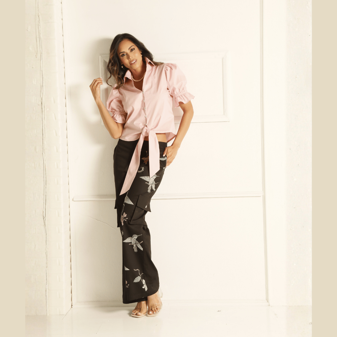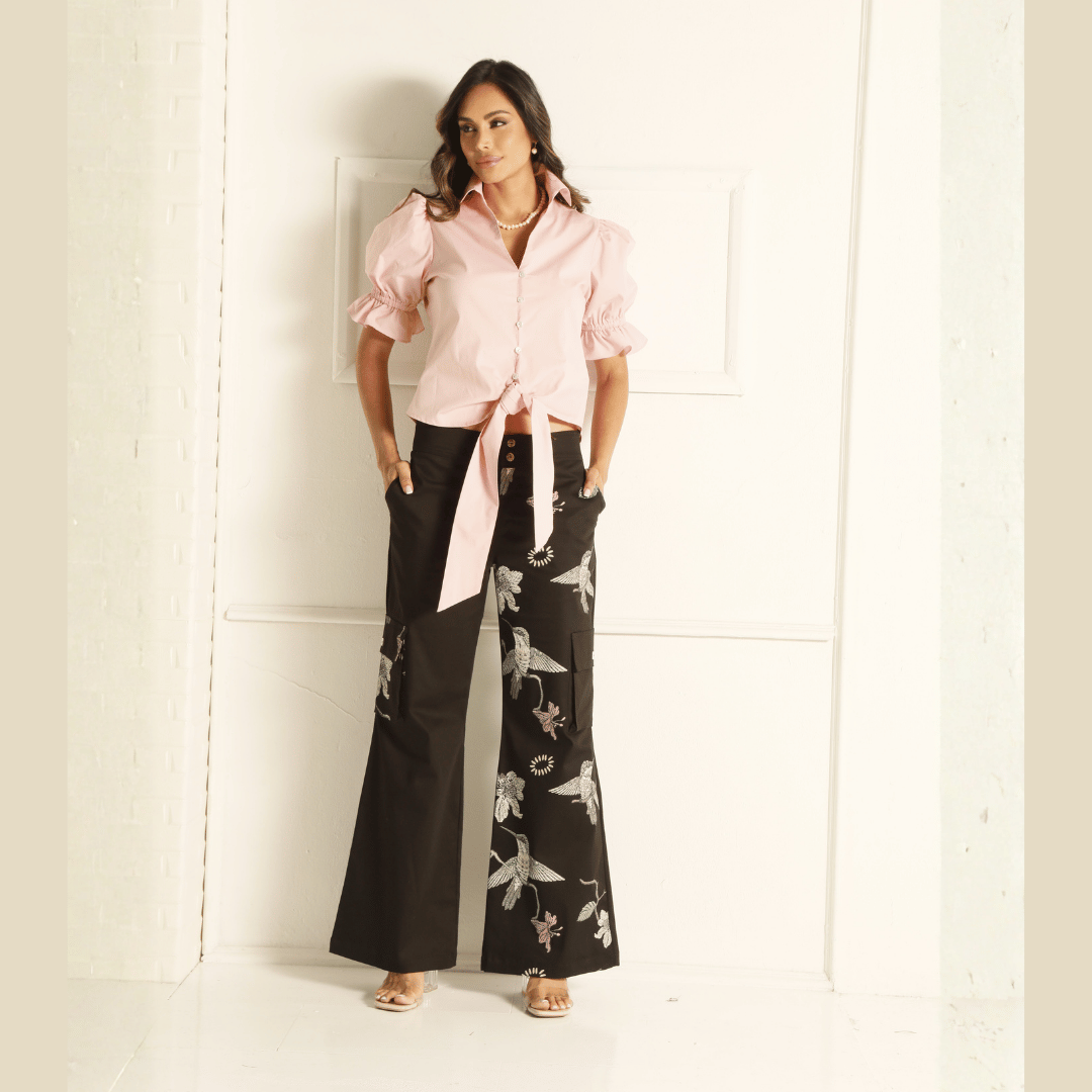El pantalón Conjuro destaca por su diseño amplio y contemporáneo, que aporta fuerza y personalidad al look. Su silueta estructurada y caída elegante lo convierten en una prenda clave para outfits sofisticados.